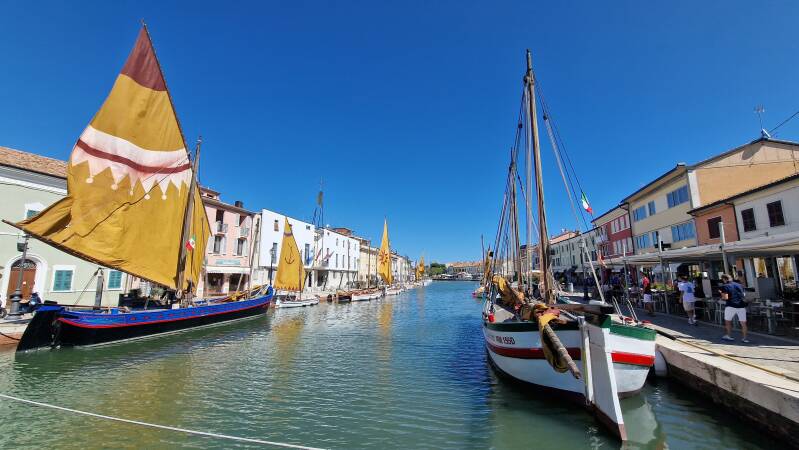 Der Tag beginnt tierisch. Beim Öffnen des Kleiderschranks fliegt mir ein grosser Windenschwärmer entgegen. Und draussen krabbelt ein schönes Exemplar der hier häufigen Ruinen-Eidechse um den Landy. Unsere heutige Radtour führt nach Cesenatico. Beim ersten Gewässer beobachten wir eine Bisamratten-Familie bei Schwimmübungen und in Cesenatico bewundern wir die alten, farbenprächtigen Boote im Schifffahrts Museum. Unsere Radfahrt führt uns dann ins Landesinnere, entlang von Baumnuss- und Apfelplantagen wieder zurück zum Campingplatz.