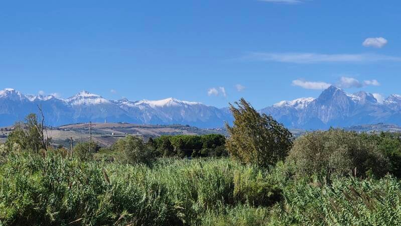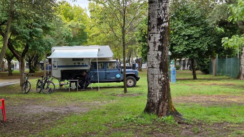 Auf "Roadsurfer" haben wir den Camping Aziende Agricola Abbruzzetti ausfindig gemacht. Schon während der Hinfahrt trübt das Wetter ein. Bei der Ankunft über eine steile Strasse empfängt uns ein alter 109er Land Rover und wir geniessen die schöne Aussicht auf die Adria. Schon bald schlägt das Wetter in Dauerregen um und wir machen den Landy mit Markise und Planen Wetterfest.