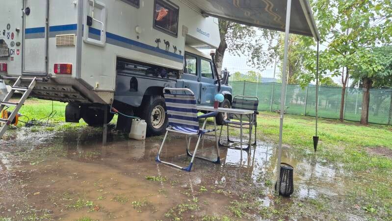 Einmal um den See. Das sind etwas mehr als 40 km mit dem E-Bike. Dabei mache ich noch einen kurzen Abstecher ins Gelände. Als ich nach einigen Kilometern wieder auf die Hauptstrasse zurückkehre bin ich und das Fahrrad völlig verschmutzt. Dieser kleine Abstecher in das Gelände hat auf Komoot ganz einfach ausgesehen... Kurze Zeit später zieht ein heftiges Gewitter auf. Völlig durchnässt gehen wir in einem kleinen COOP noch rasch ein paar Einkäufe erledigen und schliessen die Umrundung ab. Bei unserer Rückkehr steht der Landy in einer grossen Wasserpfütze, so dass wir ihn ein paar Meter nach vorne schieben um im Trockenen zu stehen.