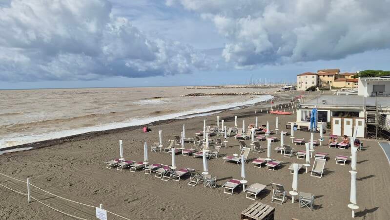 Bei Orbetello finden wir etwas nördlich eine landschaftlich interessante Halbinsel und den etwas abgewrackten Giannella Camping. Dieser wird auf der einen Seite von der Lagune und auf der anderen Seite vom Mittelmeer eingerahmt. An einem der durchgerosteten WC Verschlüsse verletze ich mich am Finger, was noch zu einer schmerzenden Entzündung führen wird. Wir fahren mit den E-Bikes zum Badestrand Tuscany Bay Beach, der etwas ausserhalb des Campingplatzes liegt.
