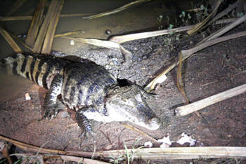 Nach dem vorzüglichen Nachtessen gehen wir hinunter zur Lagune, um die Brillenkaimane zu füttern. Alfredo macht das auf eine sehr humorvolle Art: Fünf, Sechs, Sieben Leute& Wenn wir zurück gehen muss wieder gezählt werden, die Kaimane sind sehr hungrig."