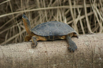 Zurück in der Lodge gehen wir wieder in den angrenzenden Regenwald. In sumpfigem Gebiet wurde kürzlich eine schlegelsche Lanzenotter gesichtet. Wir machen uns auf die Suche, leider erfolglos. Trotzdem ist das Trekking ein Erfolg: Ein prächtiger Trogon setzt sich neben uns auf einen Ast, wir können einen grossen Eisvogel bewundern, entdecken beide Arten Pfeilgiftfröschchen, Soldaten Aaras, einen kleinen, braunen Frosch sowie ein Tuberkel-Hokko Weibchen.Von Mücken umschwärmt treten wir den Rückweg an und gelangen wieder zur Lodge.