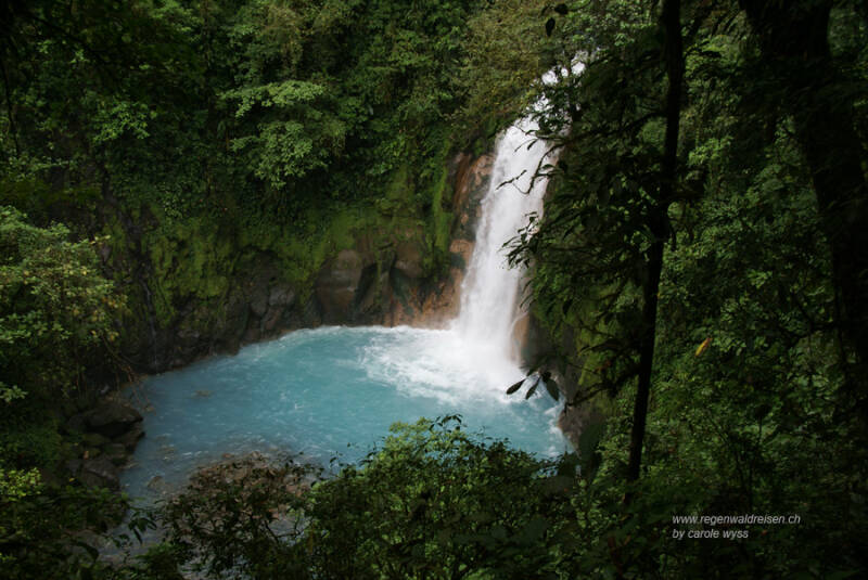 Über eine ausgewaschene Schotterpiste erreichen wir den Parkeingang zum Naturreservat Tenorio. Beim Rangerhäuschen sind gefundene Gifttiere und andere skurrile Geschöpfe eingemacht in Essiggläsern zu bewundern. Ein kleines Gruselkabinett. Nachdem wir dje 10$ bezahlt haben, machen wir uns auf den beschwerlichen Weg zum Rio Celeste. Unterwegs steigen wir ab zu einem wundervollen Wasserfall, dessen Becken in herrlichem blau strahlt. Weiter geht der anstrengende Pfad durch mystischen Regenwald.