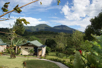 Der nette Angestellte gibt uns 2 grosse Schirme mit zum Bungalow, mit der Bemerkung, dass es gegen Abend immer stark regnet. Wir sind uns aber gewohnt, dass an unserem Ankunftstag das Wetter umschlägt und die Sonne die Überhand gewinnt. Der Vulkan Tenorio ist zwar in Wolken eingehüllt, diese lichten sich aber und geben den Blick auf den unteren Teil des dichtbewachsenen Berges frei. Der Abendhimmel wird durch einen Regenbogen in tolles Licht getaucht. Von heftigem Regen keine Spur.