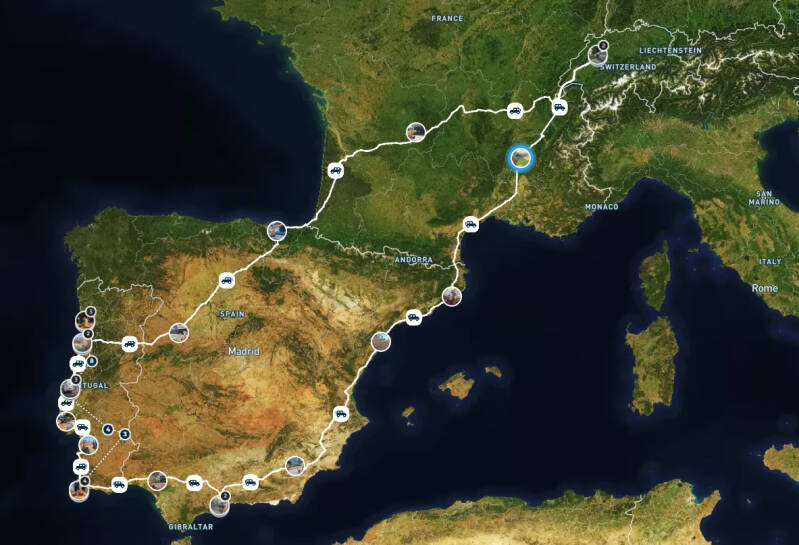 Am frühen Morgen öffne ich das schwere Eisentor und verlasse das Camp. Bei Dämmerung erkenne ich beidseits des schmalen Strassenbandes einige Kuhherden und trockenes Ackerland. Bald schon biege ich auf die (kostenlose) Autobahn ein und fahre in richtung Portugal. Der Grenzübertritt lässt sich auch optisch erahnen. War vorher noch alles flach, trocken und gelb, weicht die Szenerie nun mit Nadelbäum-Wäldern bewachsenen Hügeln, tiefen Schluchten und bizarren Gesteinsformationen. Ich bin im wilden Norden Portugals angekommen. Etwa zur selben Zeit fliegt Carole mit ihrem Swiss Flug dem Ziel entgegen. Praktisch mit meiner Ankuft schliessen wir uns auf dem Campingplatz Orbitur in die Arme. Ab hier bis Malaga wird die Reise zu zweit weitergehen. Zuerst jedoch muss ich einen Platten am Hinterrad meines Fahrrades flicken. Dumm nur, dass mir dabei das Ventil abbricht (Glücksbringer Giraffi ist auch am Tag 4 der Reise sehr zurückhaltend). Mit Caroles E-Bicke fahre ich zum Nächsten Fahrradhändler und bersorge mir einen (fast) passenden Ersatzschlauch. Dieser sollte es auch tun. Am Nachmittag eine kurze Radtour entland des stürmischen Atlantik zum Fluss Duro und ein sehr feines und zugleich sehr günstiges Abendessen mit Sonnenuntergang am Meer. Wir sind angekommen.