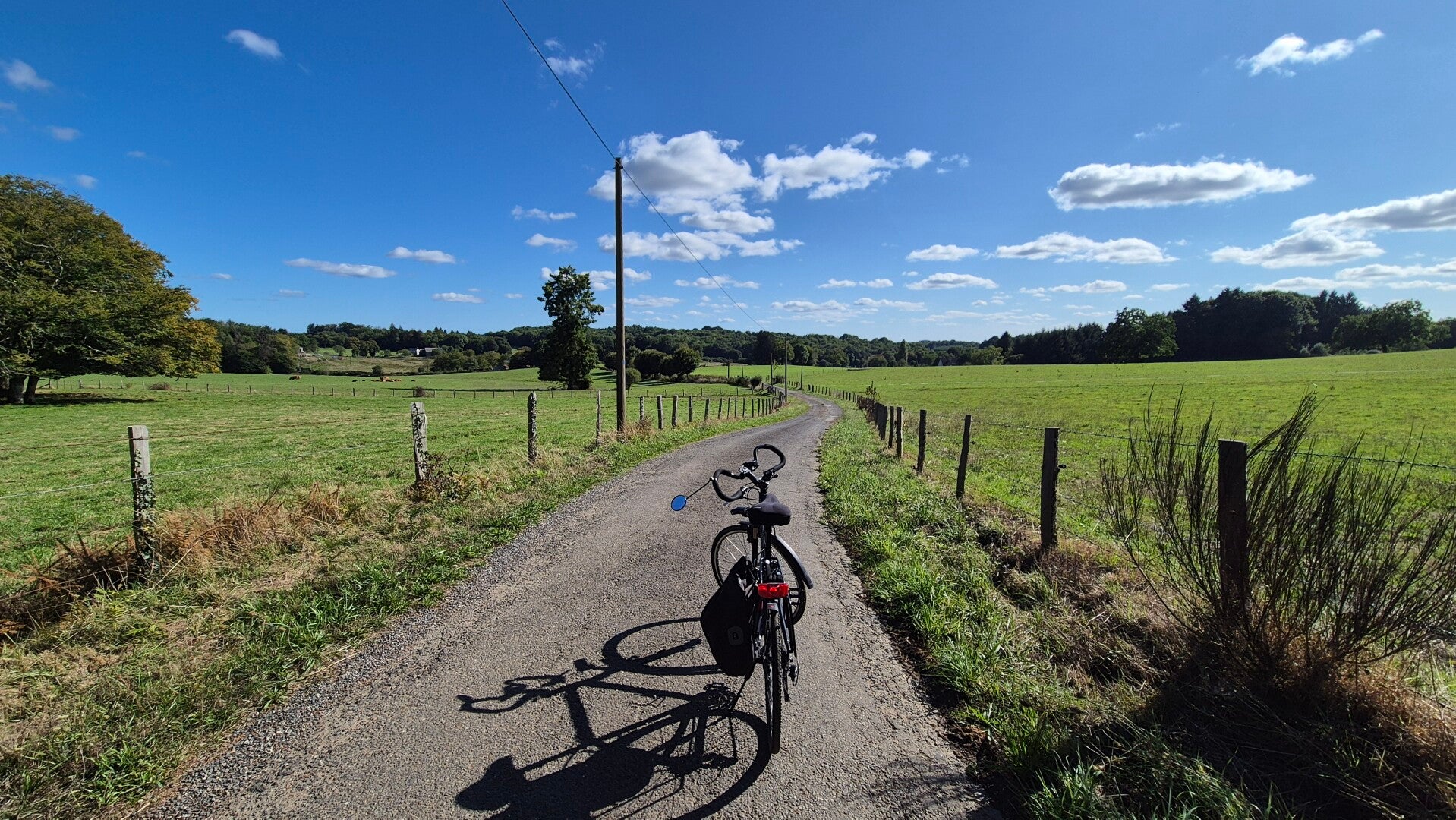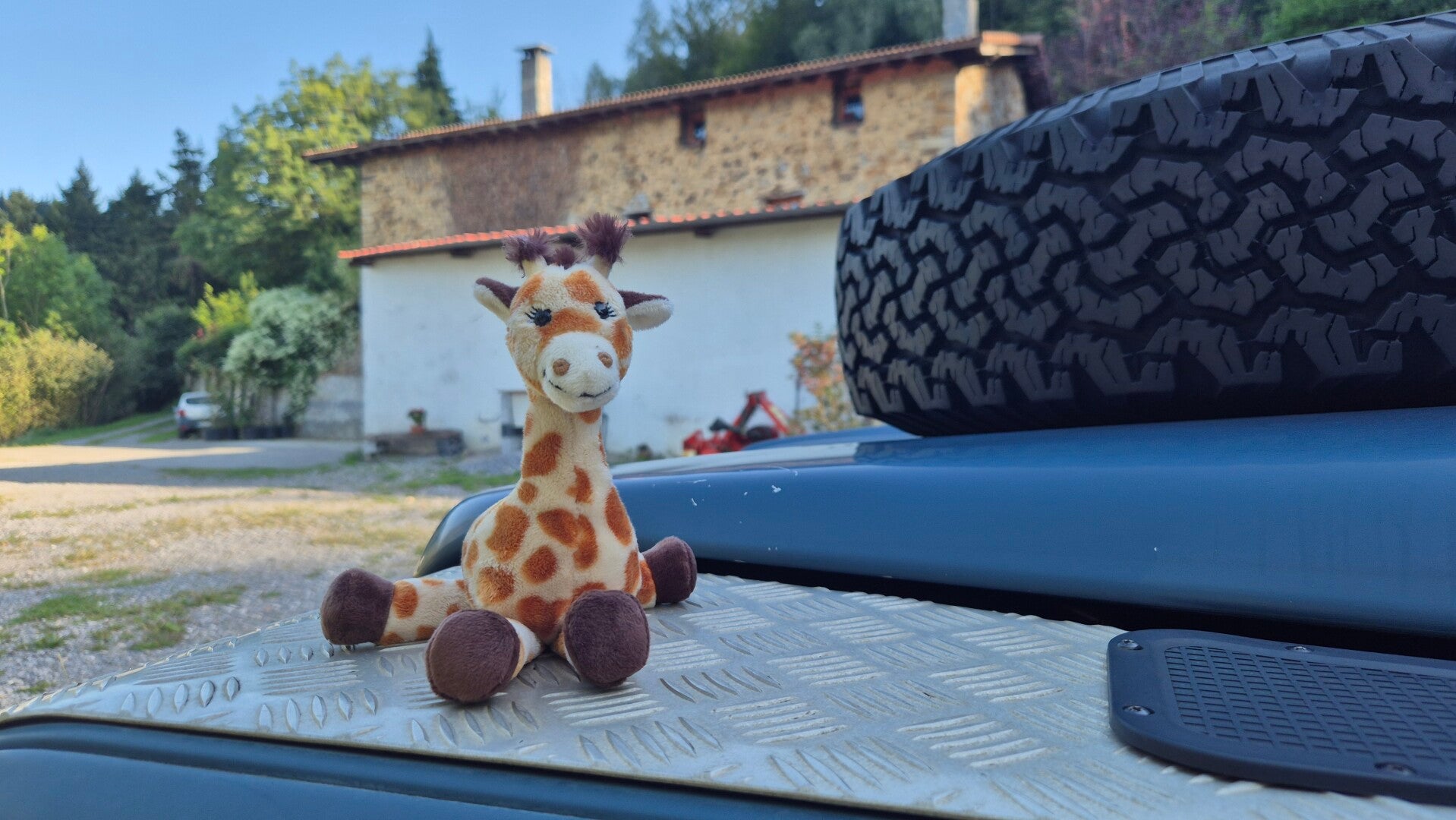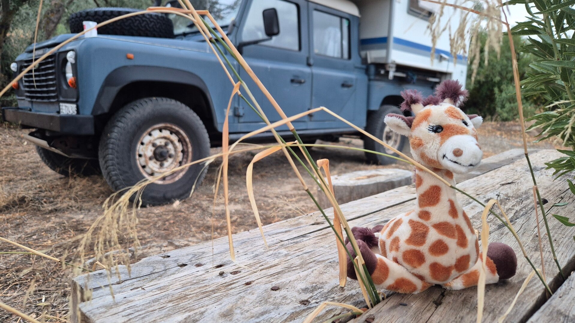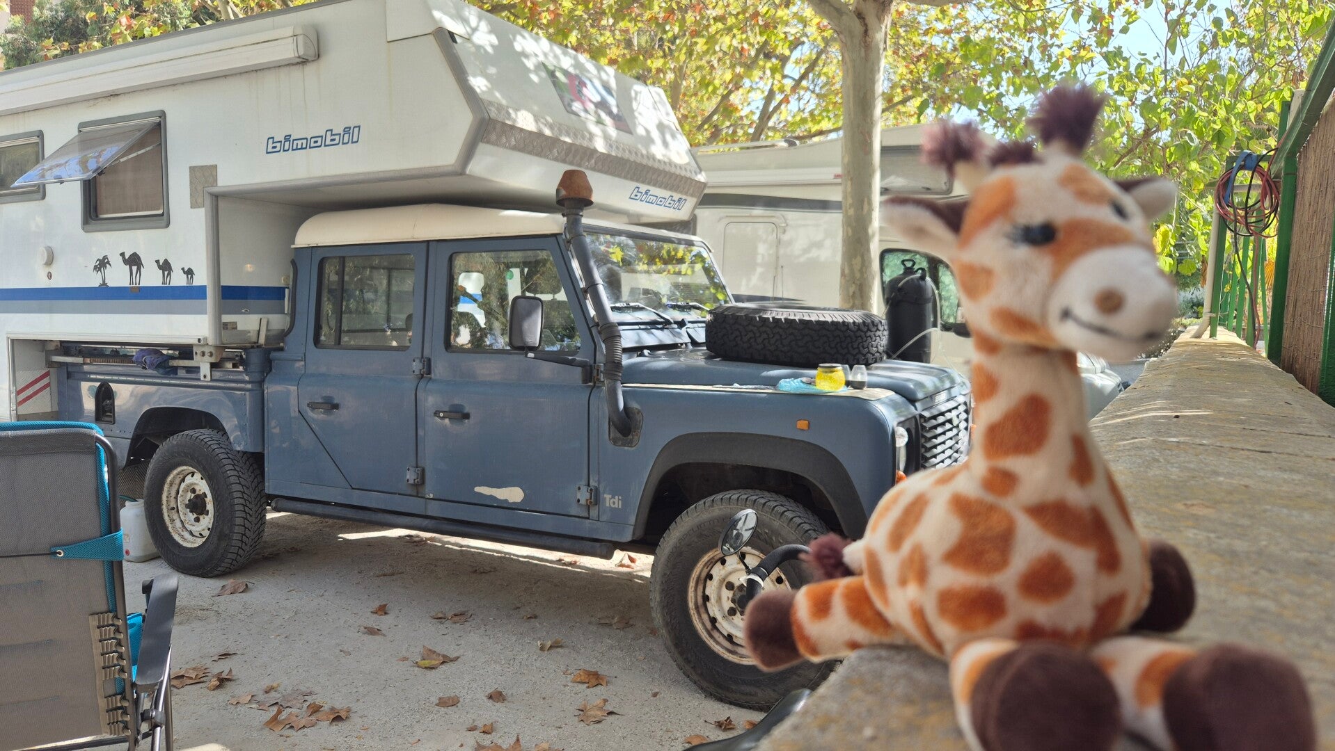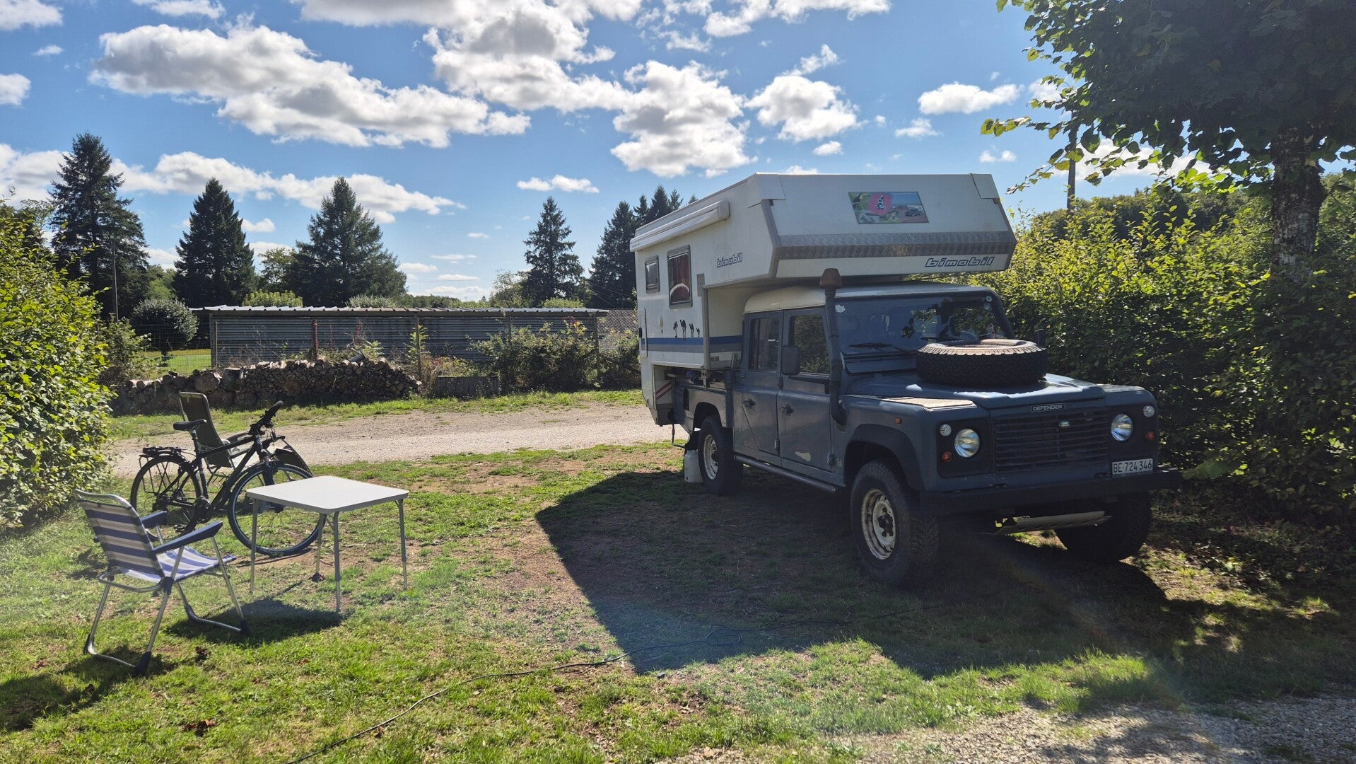 Am morgen in aller Früh verabschiede ich mich von Carole. Wir werden uns am Montag in Porto wieder sehen. Unterdessen fahre ich mit dem Landy und mit Glücksbringer "Giraffi" eine erste Etappe. Mit gedrosseltem Tempo erreiche ich nach etwas mehr als 9 Stunden das beschauliche Lagrauliere. Zuvor hat mich die Fahrsperre geärgert. Nichts ging mehr. Giraffi muss sich noch steigern. Der Camping Baroudeurs ist hübsch und der Besitzer ganz nett. Leider ist Nachsaison: Pool zu, Warmwasser aus. Dann noch 10 km aufs Fahrrad. Ich beisse mich durch das hügelige Terrain, als ich einen Jagdhund mit Welpen erblicke. Dieser rennt auf mich zu und mit viel Glück bleibts bei einer feuchten Berührung. Giraffi ist nicht dabei. Am Abend gönne ich mir im Campingrestaurant eine Pizza.