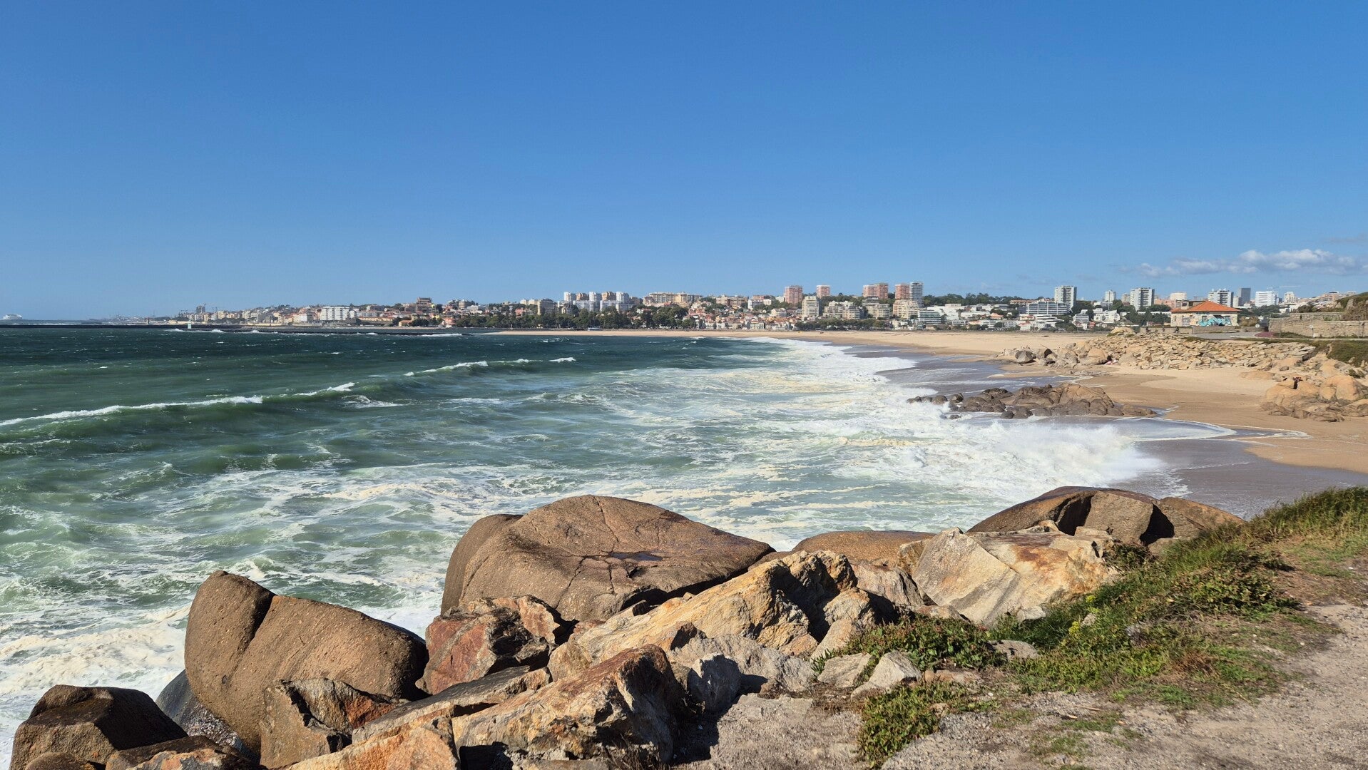 Gegen 10 Uhr geht's auf die "Porto Bike Route". So jedenfalls steht's auf der durch die KI vorgeschlagenen Route, die ich auf Komoot geladen habe. Carole auf E- und ich auf Bike werden dabei auch 350 Höhenmeter überwinden. Die Stadt ist bekannt für die beidseits des Douro ansteigende Topografie. Gleich zu Beginn folgt ein hier typischer Belag und wir holpern über Pflastersteine. Hoch über dem Fluss Douro bestaunen wir die farbigen Häuschen des Altstadtbezirks Ribeira. Diese schmiegen sich wie in einem Gemälde an die Hänge der Stadt. Dann geht's über den unteren Teil der imposanten Stahlbrücke Dom Luis I auf die andere Stadtseite, wo wir in einem Restaurant das muntere Treiben auf und um den Fluss beobachten. Unterwegs sammeln wir noch viele Eindrücke, wechseln über den beeindruckend hohen oberen Teil der Stahlbrücke wieder die Stadtseite und beenden nach gut 5 1/2 Stunden ziemlich erschöpft unsere Radtour. Wir beschliessen den Tag mit einem kurzen Spaziergang an den aufgewühlten Atlantik.