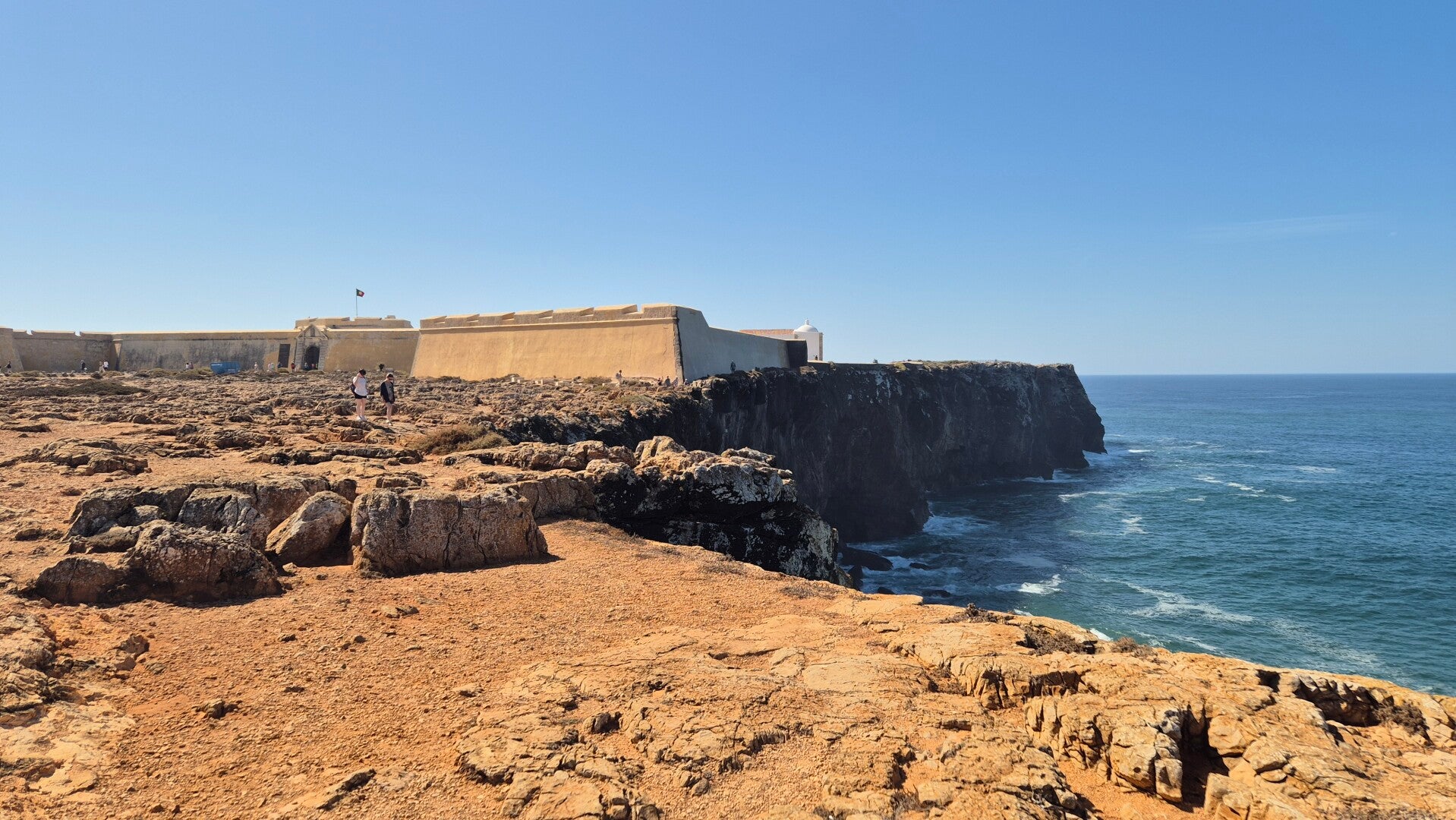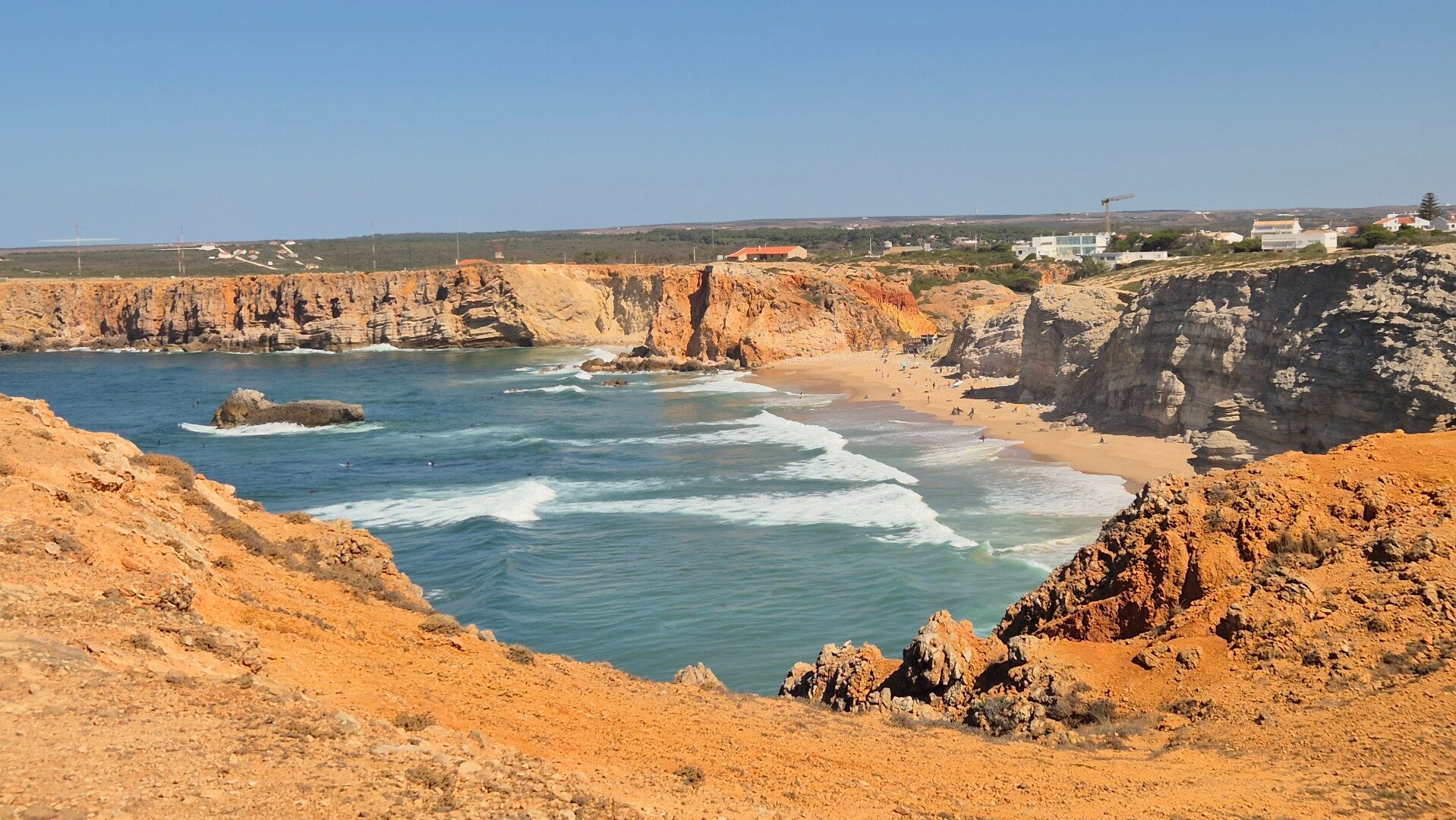 Wir verlassen das Camp über die staubige Zufahrtsstrasse, wo beidseits markante Kork-Bäume stehen und fahren nach etwa einer halben Stunde durch übel riechende Industriezonen mit riesigen Oel-Raffinerien. Kurz darauf sind wir in der Hafenstadt Sines, wo wir an der Strandpromenade einparken. Nach einem kurzen Spaziergang fahren wir auch schon wieder weiter und gönnen uns im weiteren Verlauf der Strecke noch ab- und zu einen Halt, um die prächtig rot gefärbten Felsvorsprünge der Algarve zu bewundern. In Sagres biegen wir auf den Parque de Campismo Orbitur Sagres ein. Ein schöner Camping, mit Pinien und sandiger Unterlage. Gratis dazu gibt es bis 18.00 Uhr Fliegenschwärme, die ab 18.00 Uhr von Mosquito-Schwärmen abgelöst werden. Am nächsten Tag erkunden wir die Gegend mit unseren Fahrrädern. Die Fahrt geht zum Fischereihafen, weiter zum Fort Fortaleza de Sagres und letztlich zum Süd-Westlichsten Punkt, dem Leuchtturm am Cap von Sao Vicente. Passend steht dort die Frittenbude "Letzte Bratwurst vor Amerika".