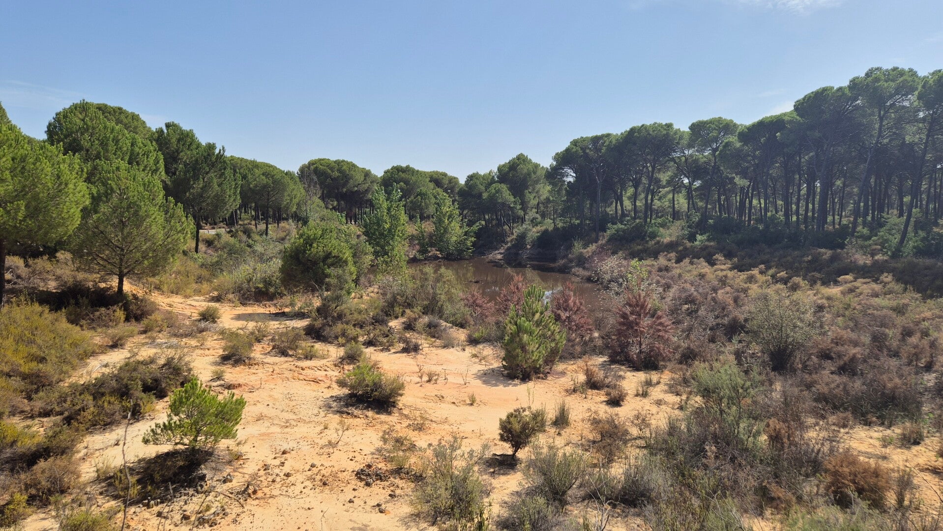 Am Morgen entdecken wir im Baum eine Blauelster. Diese Vogelart ist hier recht häufig. Auf der Fahrt nach Malaga haben wir bei Halbzeit eine Übernachtung eingeplant. Der Huttopia Parque de Doñana liegt mitten im gleichnamigen Nationalpark. Eine kurze Radfahrt führt zu einem See. Die sandigen Wege sind jedoch mit dem Fahrrad kaum zu meistern. Danach geniessen wir das schöne Camp mitten im Pinienwald, wo zwei schöne Poolanlagen für Abkühlung sorgen. Eigentlich möchten wir unseren Hochzeitstag bei einer Pizza im Campingrestaurant ausklingen lassen. Aber die gross angekündigten Pizza's sind alle. Also holt die Küche das letzte aus dem Vorrat heraus und serviert Tapas mit der Bemerkung The last one.