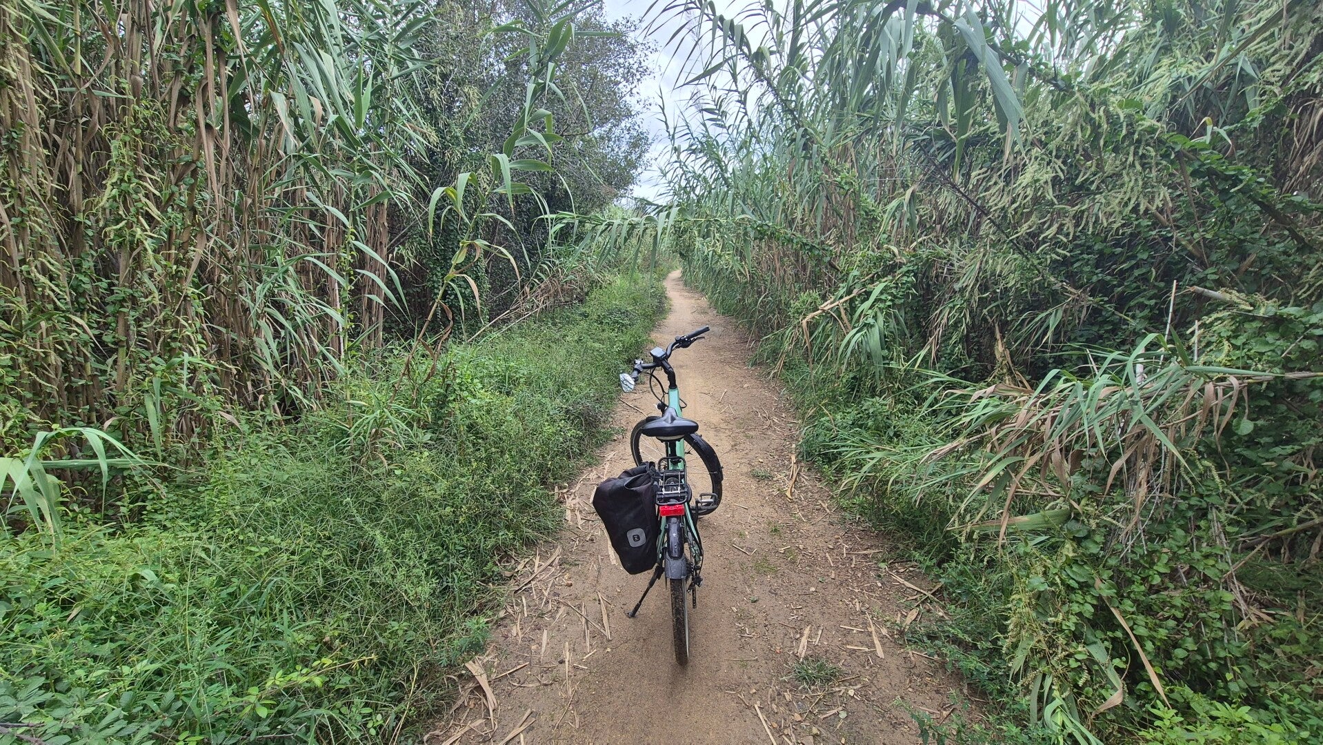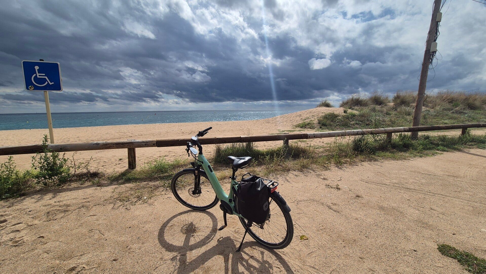 Die Fahrt führt nun von der Provinz Valencia in die "abtrünnige" Provinz Katalonien. Vor Barcelona kann ich noch kurz einen Blick auf die Sagrada Familia, das Wahrzeichen der Stadt werfen, und schon rolle ich in die alltägliche Rush-Hour der Grossstadt. Diverse Motorradfahrer haben hier die Engelsflügel schon vorbestellt, sie warten nur noch auf die Auslieferung. Letztlich bin ich froh, dass mich das Gewusel unversehrt wieder ausspeit, und ich mich mit dem angebissenen Ersatz-Nerv auf dem Camping del Mar einquartieren kann. Caroles E-Bike hat noch Reststrom. Den will ich noch aufbrauchen und ich mache eine kurze Tour entlang dem Tordera, einem Fluss der trotz heutigem Regen nur wenig Wasser führt. Aber gerade dieser Regen hat die sandige Piste in ein Meer aus Pfützen und Schlammlöchern verwandelt. In diesem Sumpfgebiet sehe ich auch eine europäische Sumpfschildkröte. Anschleichen, Handy für Foto anheben, platsch... und weg ist sie. Das Abendessen in dem schmucken Camping Restaurant schmeckt vorzüglich und auch das Glas Wein (1.90 Euro!) versüsst mir den Abend. Am Abend gibts noch Milch und Wasser für eine der (zu-) vielen streunenden Katzen, die einem halt immer wieder das Herz brechen. Morgen folgt die vorletzte Etappe in die Provence.
