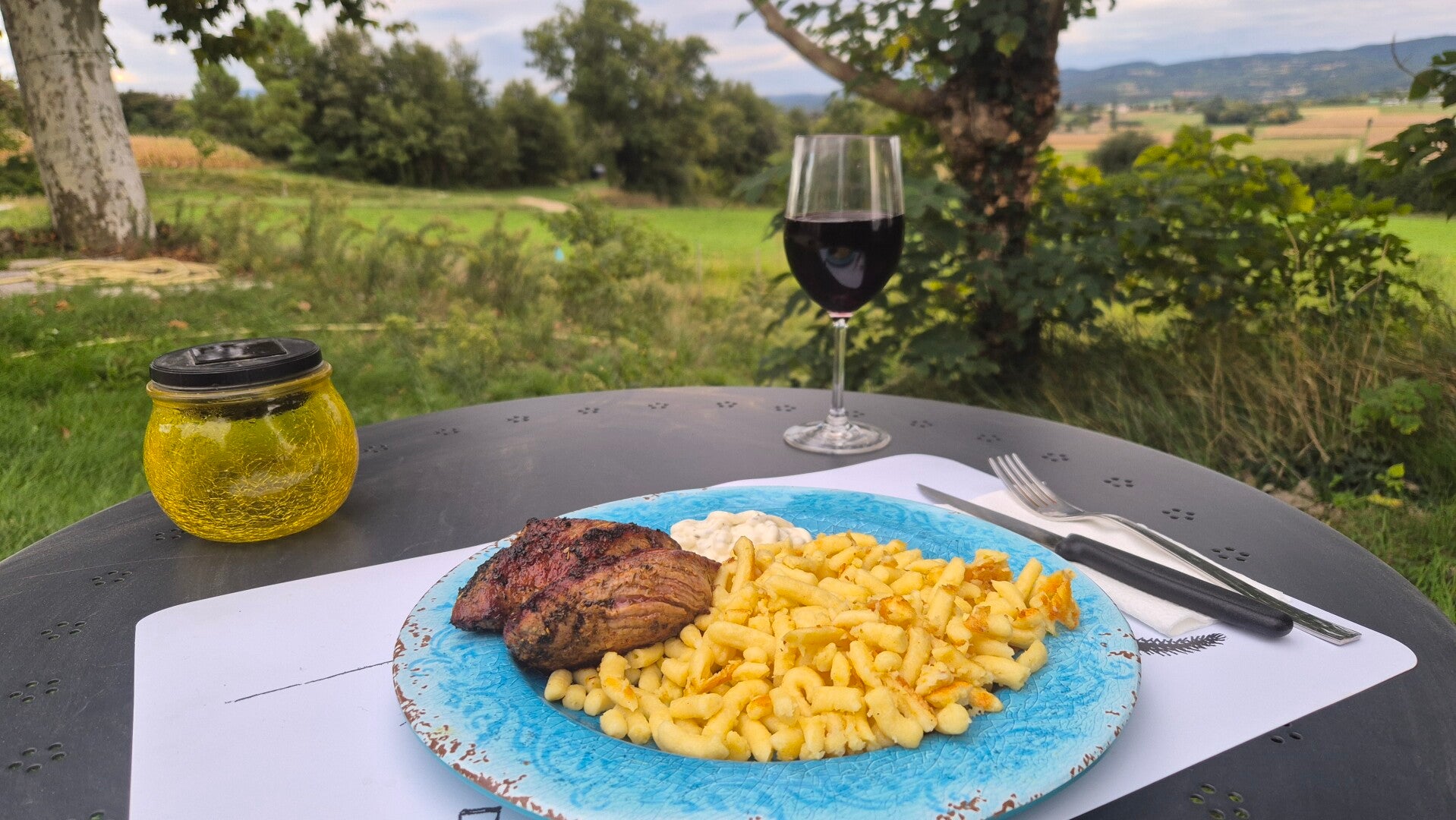 Die heutige Etappe, es ist die zweitletzte auf meiner Reise, führt mich zu "Allex". Allex ist nicht etwa mein Gastgeber, Allex ist der Name eines Dorfes am nördlichen Rand der Provence. Unterwegs sehe ich einen heftigen Unfall auf der gegenüberliegenden Seite. Verwirrte Menschen stehen um ein komplett demoliertes Auto, das von hinten in einen LKW gekracht ist. Abstand währe das Heilmittel dagegen, aber kaum jemand nimmt es. In Allex empfängt mich Jérémie, der mir auf seinem grossen Bauernhof einen Stellplatz anbietet. Es ist nun deutlich kühler als vorhin im Süden. Jérémie, mein freundlicher Gastgeber, stellt mir Tisch und Stuhl hin, und ich geniesse den Abend mit feinem kochen und... (Wie könnte es auch anders sein) feinem Essen. Meine Gedanken streifen noch einmal über die vergangenen Wochen, die vielen Begegnungen, die schöne Natur und die wunderschöne Zeit mit meiner Liebsten auf dem gemeinsamen Teil der Reise. Unser treuer Begleiter "Landy" wird auch die morgige Etappe gemütlich vor sich her schnorren und letztlich 5'377 km mehr auf dem Tacho haben.