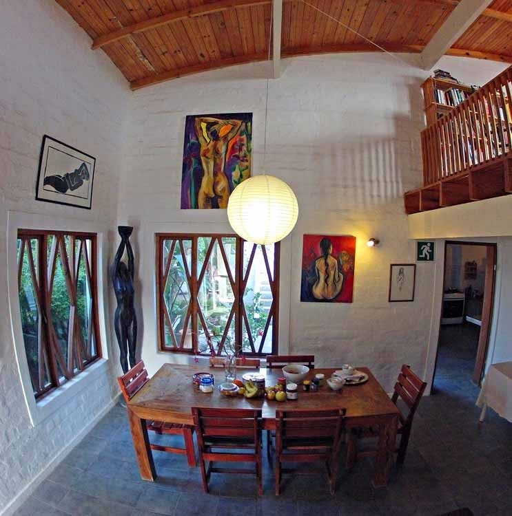 Die Unterbringung interessanter Menschen war eine natürliche Entwicklung im Leben der Galerie. Mit seiner umfangreichen Sammlung namibischer Kunst und Fotografie, die großzügig in allen Zimmern ausgestellt ist, weiß getünchten Wänden, einem wunderschönen Garten mit grünen Rasenflächen, Palmen, Bananen- und Olivenbäumen fördert die Alternative Space-Unterkunft Freundschaft, Sinnlichkeit und Romantik.
